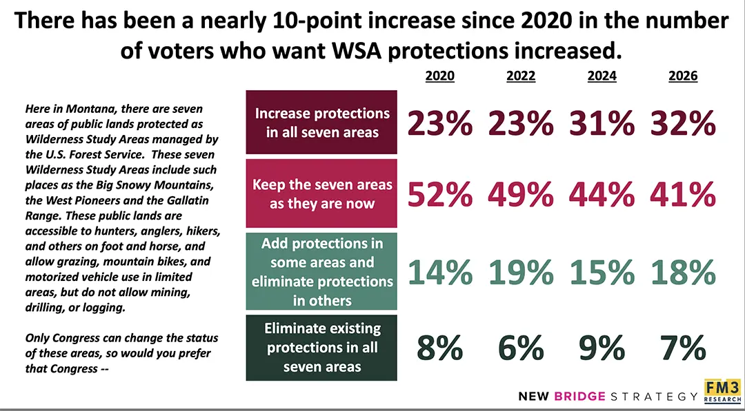 Almost three-quarters of Montanans believe that WSA protections should be maintained or increased, significantly higher than just six years ago. This robust support is across party lines and state demographics.